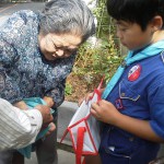 ボーイ隊の班長が音頭をとり、皆で声を合わせて、「赤い羽根共同募金をよろしくお願いします。」とスカウトが大きな声で買い物客に呼びかけると、「ご苦労さん」と皆、笑顔で返してくれました。