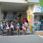 ビーバー隊・カブ隊・ボーイ隊・ベンチャー隊の各隊は2グループに別れ、町内の”サンエー食品館”と”かねひでマリンタウン店”で約1時間に渡り、商店を訪れるお客さんに募金活動を呼びかけました。